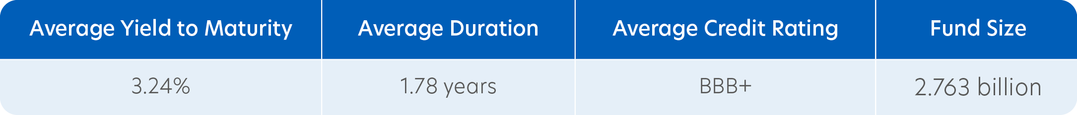 The Fund has a weighted average annualised yield-to-maturity of 3.24%*. It also maintains an effective duration of 1.78 years* to minimise interest rate risk.
