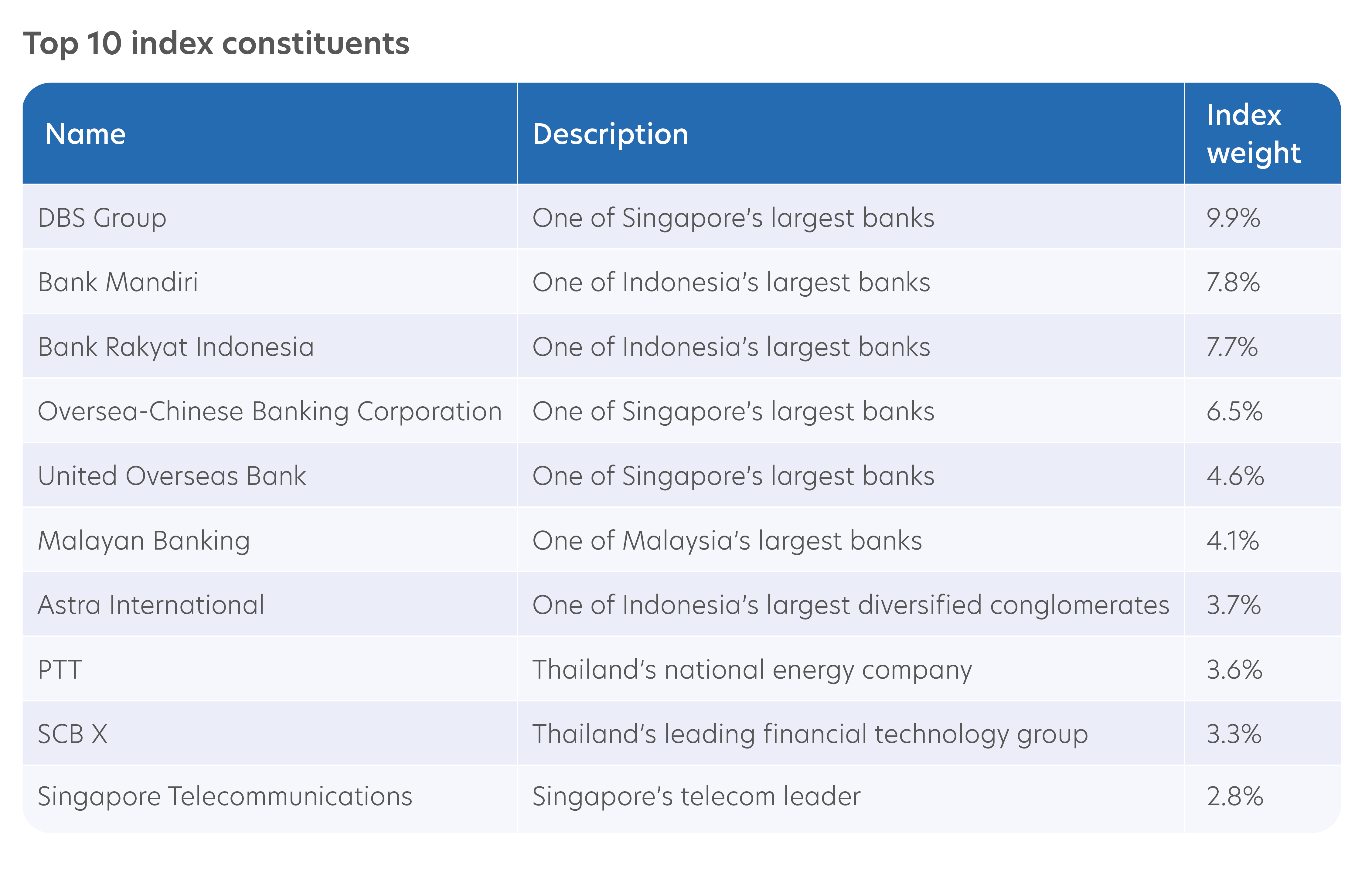 The Index focuses on ASEAN’s regional champions, companies with strong fundamentals and proven dividend track records5. It provides exposure to leading companies across five key ASEAN markets — Singapore, Malaysia, Indonesia, Thailand, and the Philippines — with significant allocations to stable, income-generating industries like Financials, Telecommunications, and Utilities to help reduce portfolio risk.